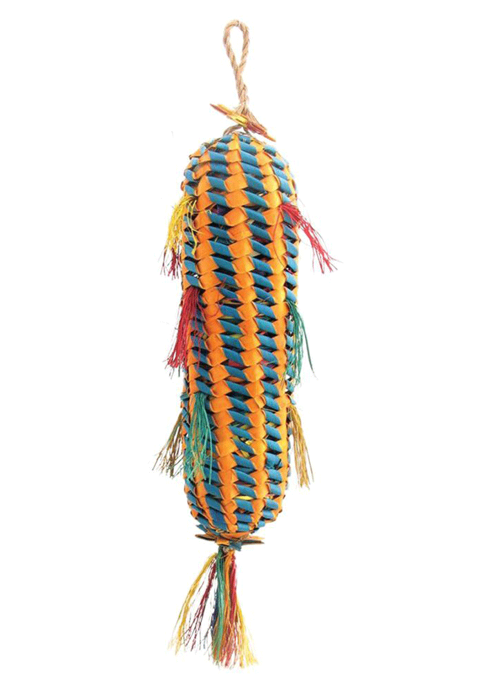 Satisfy your bird’s desire to chew and destroy things with this Pinata bird toy! It’s two toys in one! Crunchy, hand-woven palm leaf on the outside and natural fibres and shredders tied to a rope on the inside. Birds will spend countless hours chewing through the outside, just to find a surprising amount of chewing pleasure waiting for them on the inside.
