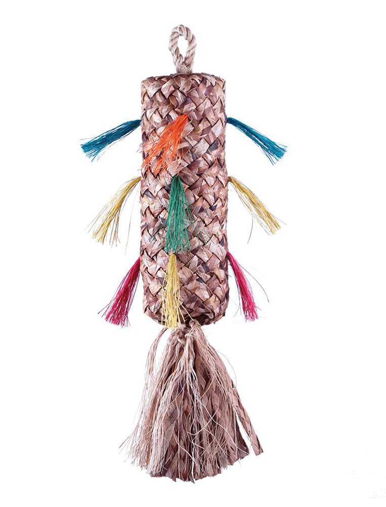 Satisfy your bird’s desire to chew and destroy things with this Pinata bird toy! It’s two toys in one! Crunchy, hand-woven palm leaf on the outside and natural fibres and shredders tied to a rope on the inside. Birds will spend countless hours chewing through the outside, just to find a surprising amount of chewing pleasure waiting for them on the inside.