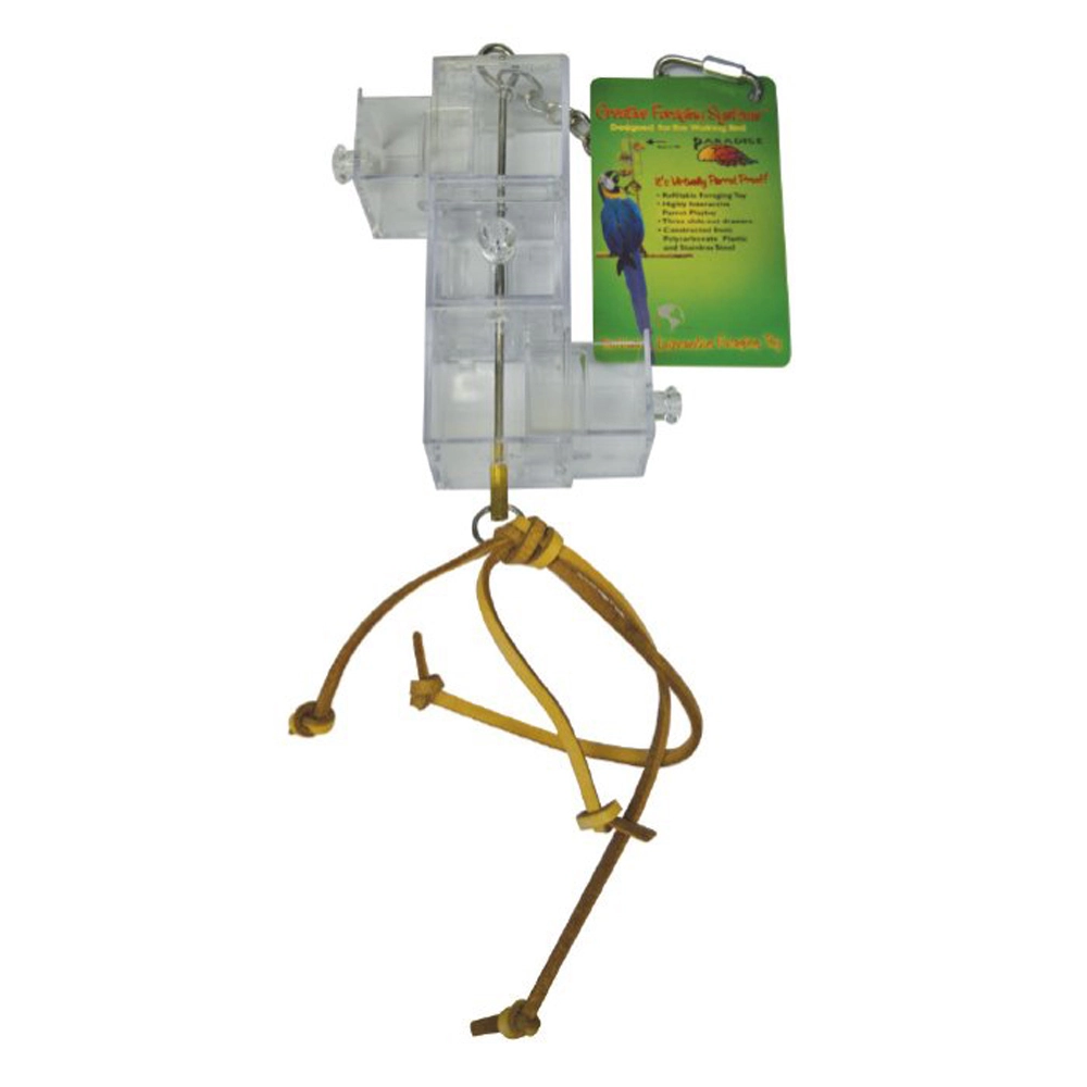The 3 Pull-Out Drawers Toy features three 3x5cm pull-out compartments that your bird can open to reveal treats inside. Slide out & fill these poly carbonate, cube-shaped compartments with bird treats for foraging fun. Leather strips hang from bottom of toy for your birds preening enjoyment.