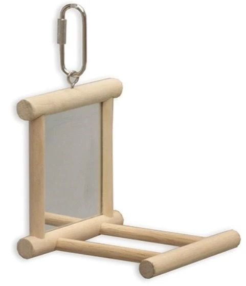 Birds love mirrors. This one is made with a wood frame and a landing perch in front.