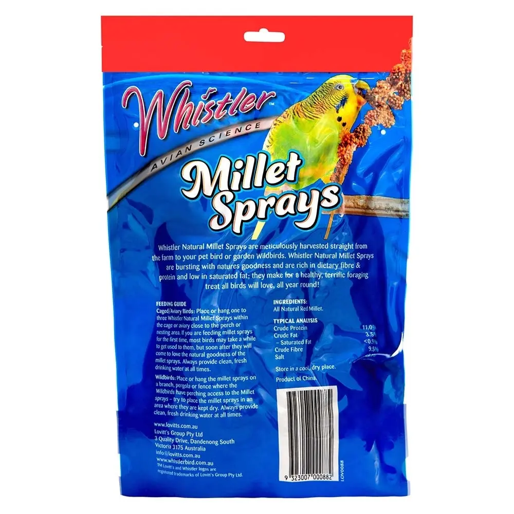 Keep your pet birds happy and healthy with nutritious, all-natural millet feeds! The Whistler Natural Millet Spray Bird Treat was harvested straight from farms, making it a fresh and healthy snack for birds. Has a low saturated fat and packed with protein and dietary fibre. Hang it in branches, fences or feed by hand. Attracts a wide variety of domestic & wild birds and makes a terrific, all year round favourite treat for them. Add this to your pet’s regular diet and always provide fresh drinking water to keep your birds chirpy and singing all-day-long!